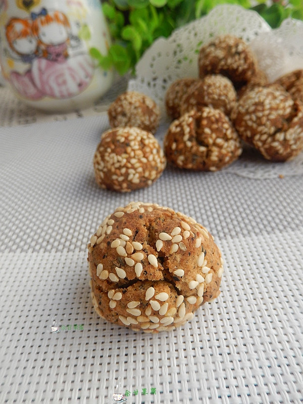 5:拌匀后,取少许和好的面粉,捏团再搓成小球。粘上白芝麻。