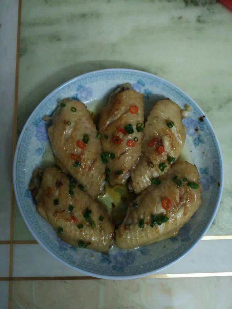 3:锅底热油,然后依次放入鸡翅小火煎至两面微微焦黄;然后在将蒜末撒在鸡翅上,稍微煎一下,同时也煎一下蒜末,这样可以增加蒜的香味;最后加点生抽,在加点热水,微微没过鸡翅,然后大火收汁,最后如果腌制的时候放盐少的话可以在加点盐,调下咸淡,就可以出锅了,最后在撒上点小葱就可以享用了~