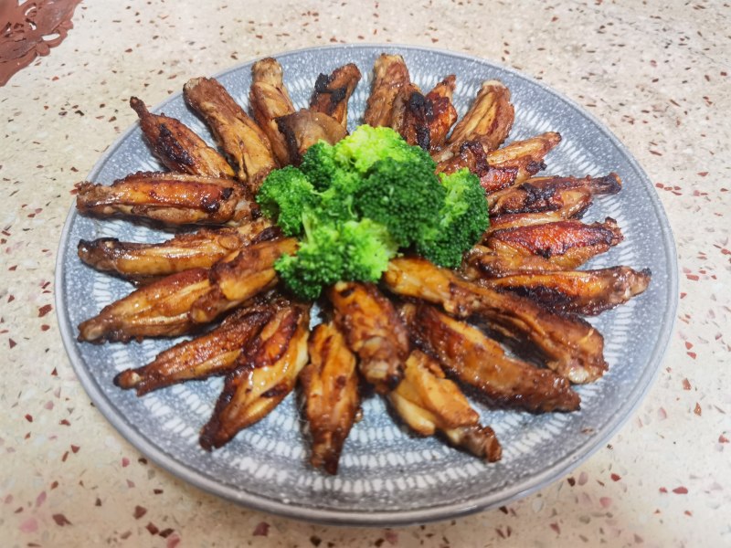 8:本来煎锅的油就下得不多,煎鸡翅过程中把鸡皮油出不少,装盘时鸡中翅是比较干香的,不会油呼呼发腻。中间摆一些焯过水的西兰花,增加颜值。