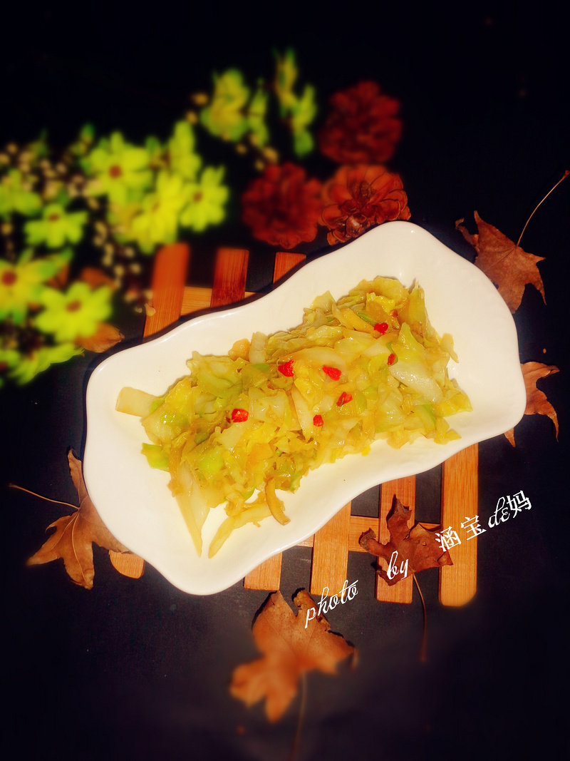 1:紫甘蓝切成细丝,一定要切细一点,要不然做出来不好吃
