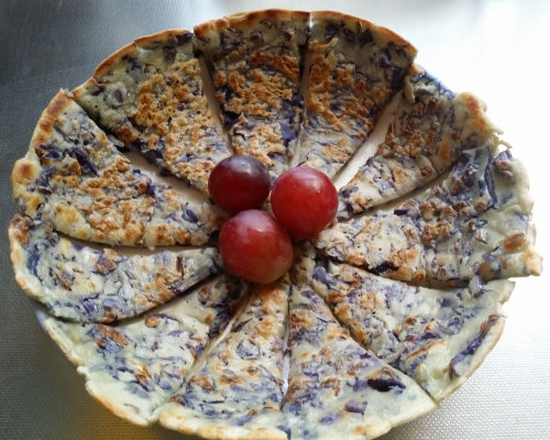 5:将紫甘蓝糊倒入锅中,摊成圆饼状。