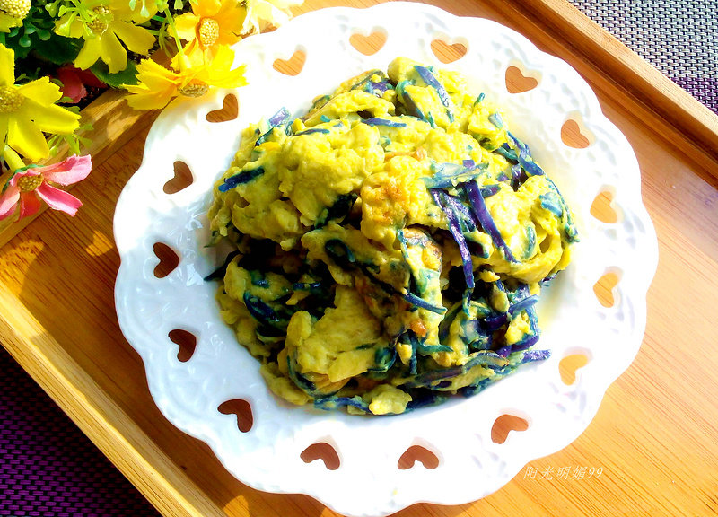 1:紫甘蓝切细丝,打入三个鸡蛋。