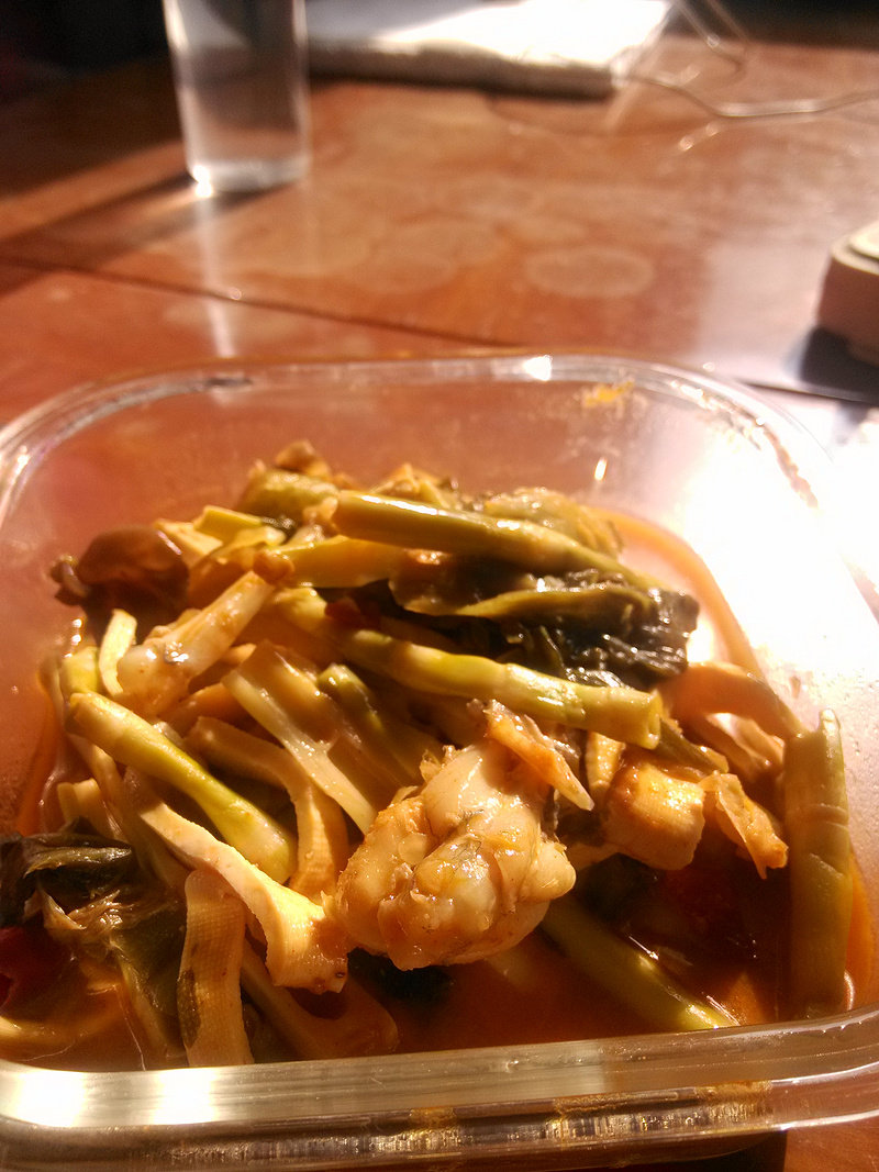牛蛙三只(去皮肉后约一斤重);扁尖笋300克;酸菜鱼全料一包;小泡椒十个;小木耳6朵;厚千张100克;