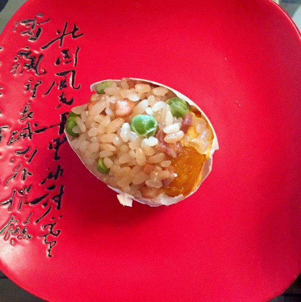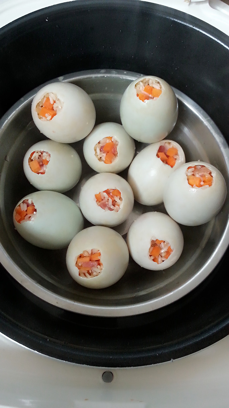 5:将糯米慢慢塞进去蛋里面.塞一半的时候可以轻轻摇一摇.是将一点米摇在下面,蛋黄可以在中间,再塞满米粒,面上放几粒红萝卜,颜色更好看,塞满后可以每一只蛋都放小半勺子清水.一点就够了.是因为怕会生米.再放锅上或者电饭锅蒸40分钟就可以吃了.
