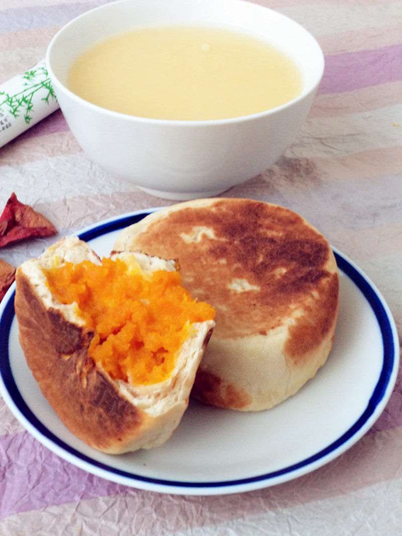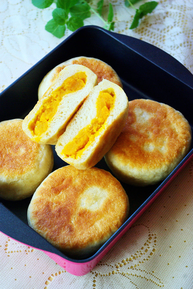 8:将南瓜馅包裹严,按扁。入电饼铛煎。