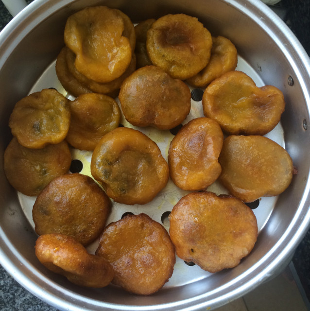 1:把南瓜蒸熟后弄烂,加入糯米粉,然后搓好