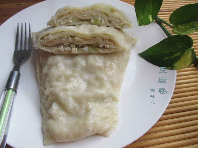4:把以上馅料均匀的抹在豆皮上,然后卷起来。卷到最后的时候,一定要连边上也有馅,这样才会将皮黏住不散开。以上馅料大概能卷5卷。