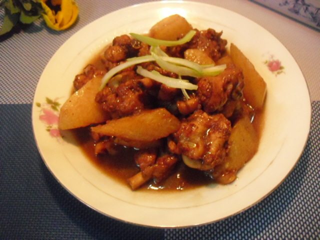 7:加入鸡汤,再加1汤匙酱油,加盖中小火焖煮;