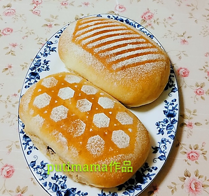 8:二次饧发好的面包坯长了一倍,再用模具用面筛入面粉呈不同图案。