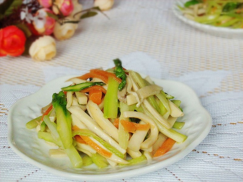 2:杏鲍菇、胡萝卜洗净切丝,芦笋去皮洗净切丝