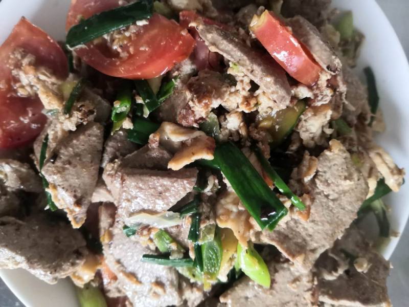 8:猪肝变色后倒入番茄,翻炒均匀。