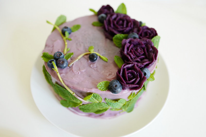 19:用淡紫色的紫薯泥像抹奶油一样抹在蛋糕上,因为薯泥有一些粘,不是很容易抹平。