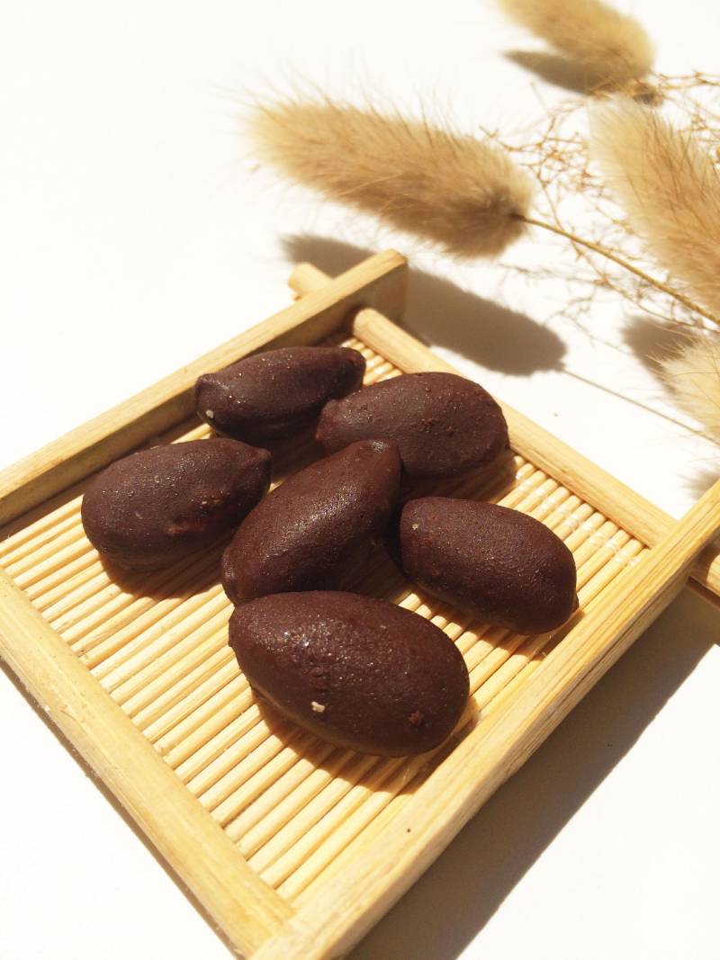 6:待杏仁表面的巧克力变硬后,用小刀轻轻刮掉杏仁豆多余的巧克力