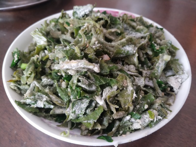4:用手搓匀,使每个桑叶都裹上面粉。