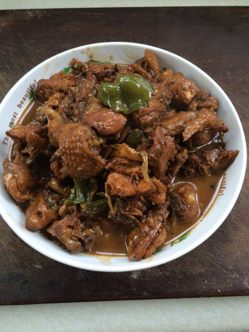 8:待汤汁粘稠后加入辣椒块,葱,芝麻,生抽,少许盐(盐加一点点或者不加,因为生抽的盐味就够了)翻炒均匀