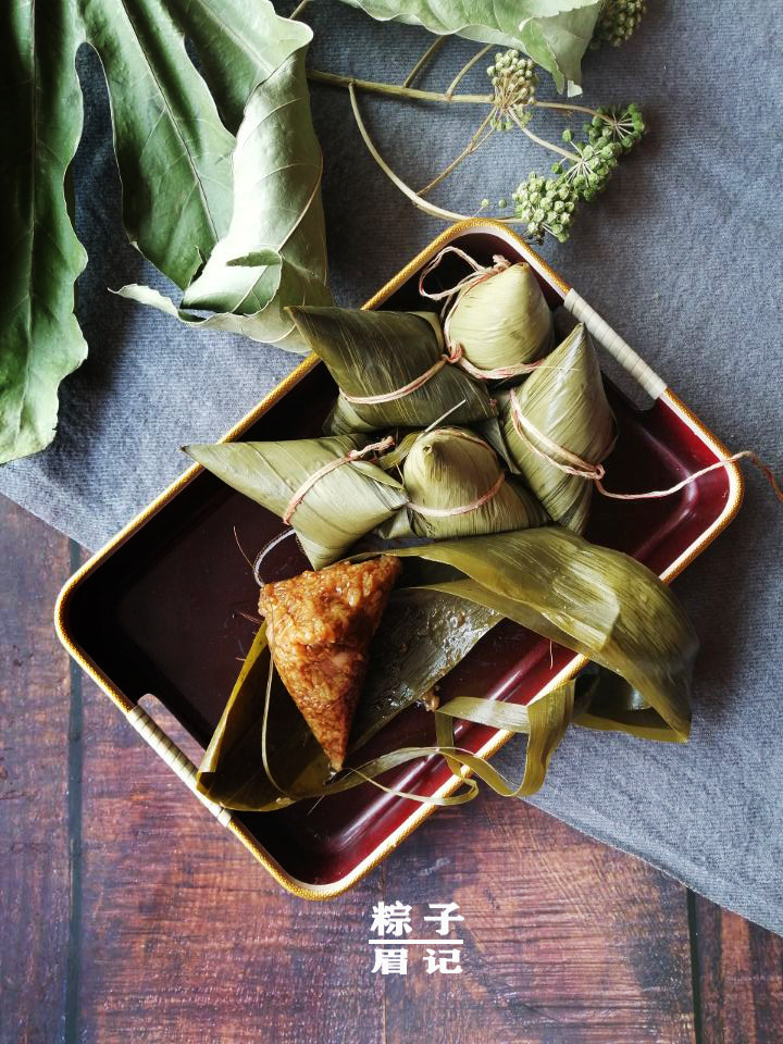 9:粽叶两片,叠在一起,但不是完全重叠,起到增加包裹面积的作用。