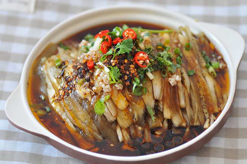 4:取出放凉,撕成条状。香菜、大蒜、小米椒切碎,撒在撕好的茄子上,然后加入盐、糖、陈醋、生抽、辣椒油调制的酱汁即可。