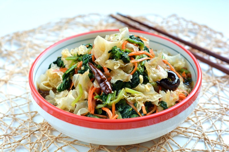 8:晾到温热的银耳与菠菜胡萝卜料汁同拌。