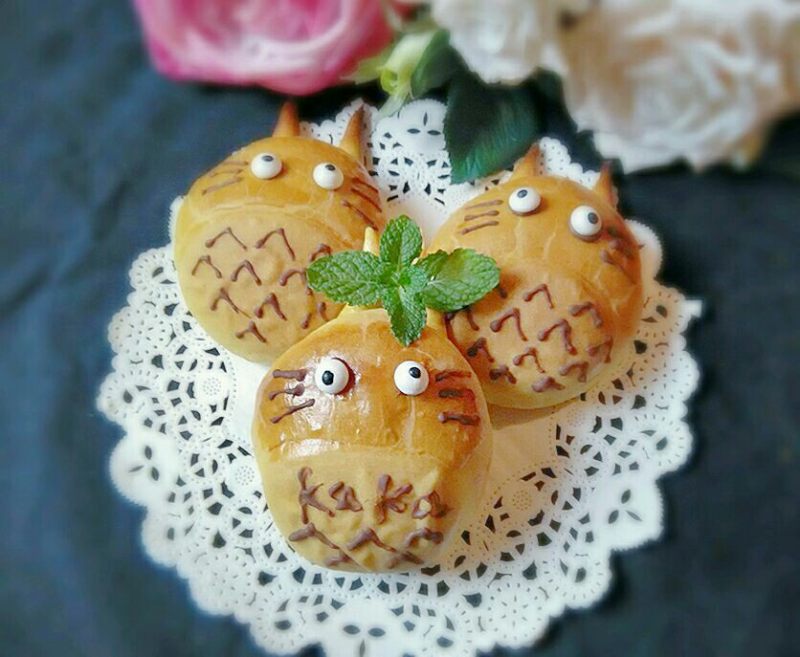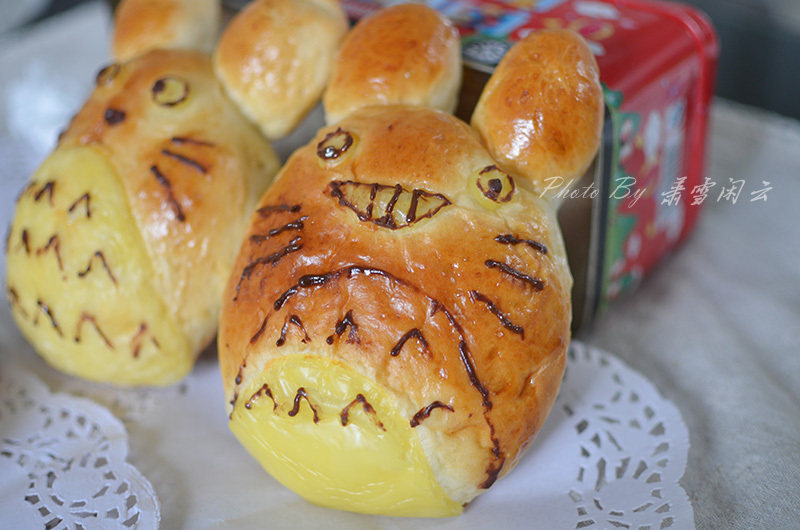 11:巧克力放入裱花袋里加热融化,然后给烤好的龙猫面包加装饰就可以了!