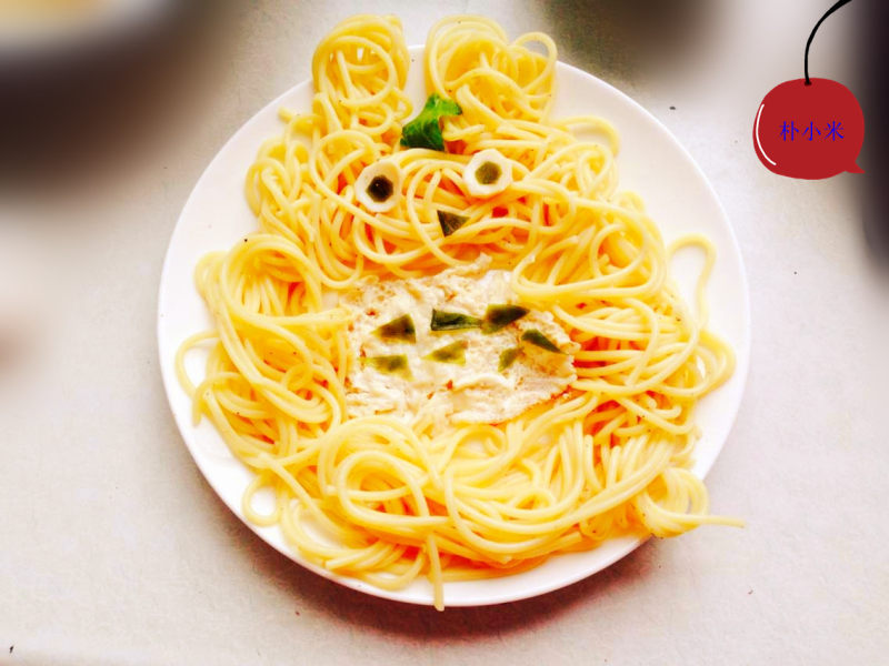 8:炒好的意大利面放入盘中,用勺子卷成两个弧度作为龙猫耳朵。海带三角形放入煎好的蛋白中,盐蛋白上放入剪的圆形海带作为眼睛。