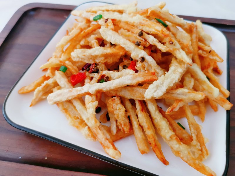 2:土豆洗净后切6-8毫米粗的条,在水中浸泡片刻洗去土豆条表面的淀粉;