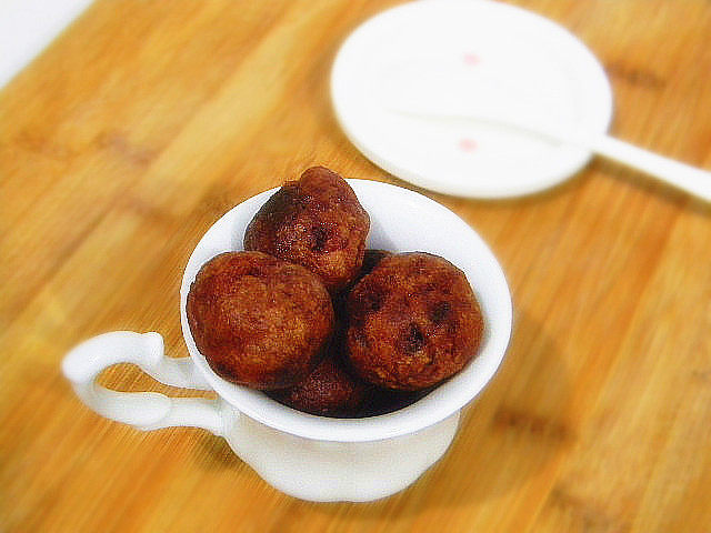 7:锅中烧油,放入干燥木筷周围会出现密集小泡时放入丸子,炸至变色即可。