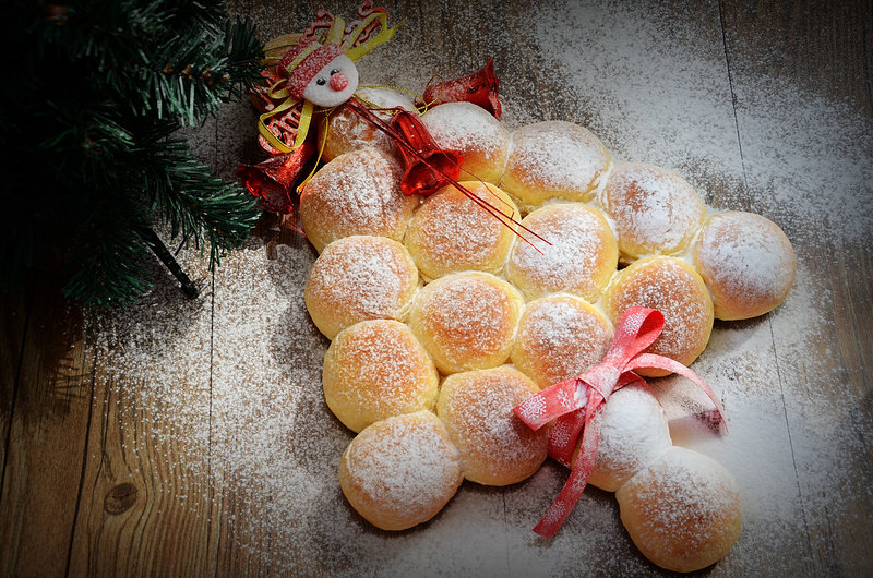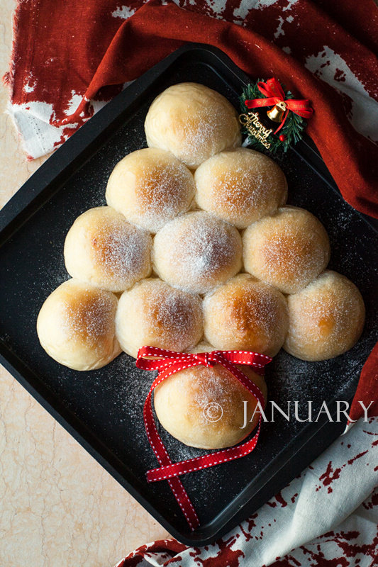 9:醒发结束,再次将面团滚圆,滚圆后的面团按圣诞树的形状放入烤盘里;树干我用2个小面团紧挨在一起;