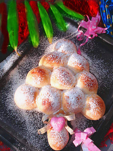 14:面团放在铺了油布的烤盘里,按5、4、3、2、1的顺序排放成树的样子,顶部再加上一个将余下的2个放在底下当树干。放烤箱选择饧发功能,底部放一盘热水保湿。