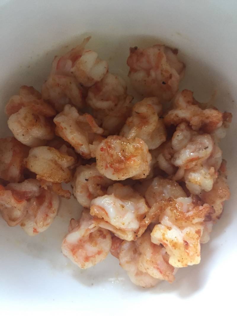 1:虾仁化冻洗净沥水,半茶匙盐、一茶匙料酒腌制10分钟,期间用筷子搅拌,使腌制均匀入味。