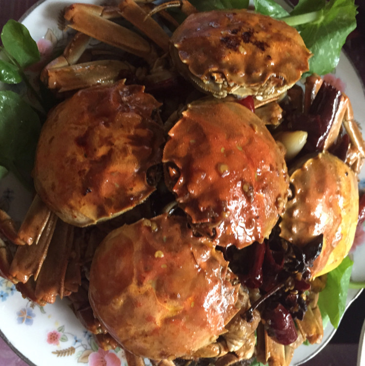 2:用热锅冷油把蟹盖尖两分钟再将身体倒入尖到金黄放入八角金辣椒大椒头翻炒