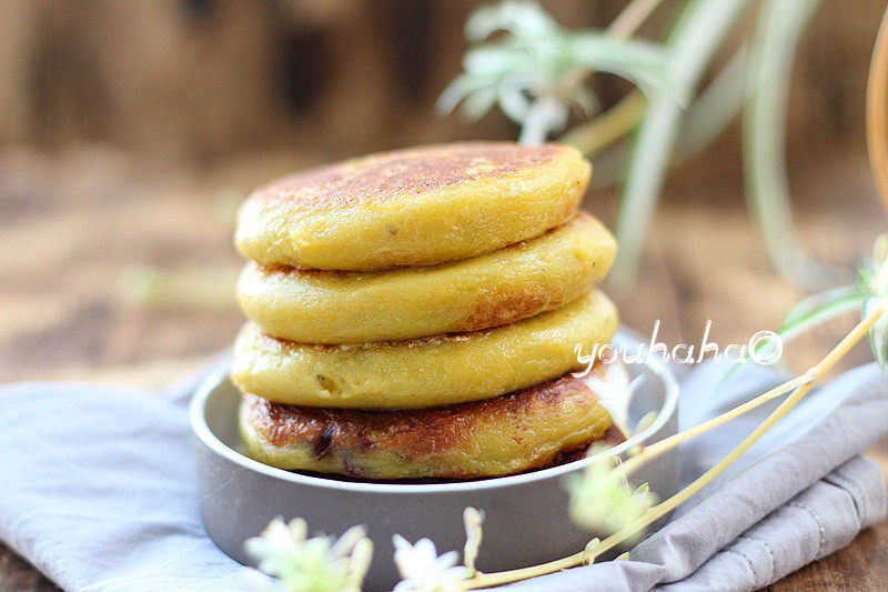 6:将红薯饼放入锅中,煎至两面金黄,中间有空心即可。
