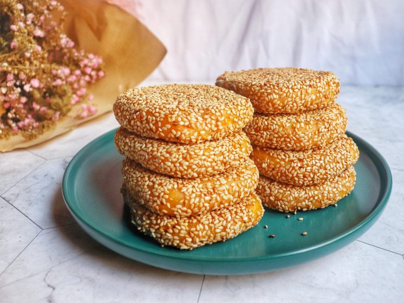 11:饼胚表面撒上白芝麻,再用手把芝麻轻轻的按实,防止煎的时候散落。