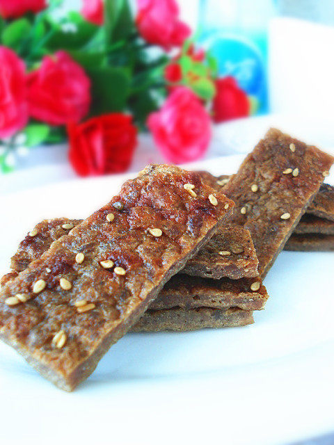 9:烤箱预热180度,5分钟。将烤盘放入中层,上下火,180度烤10分钟,取出,翻面,涂蜂蜜水,撒芝麻,继续180度烤10分钟即可。待凉后用剪刀剪成小块就完成啦。
