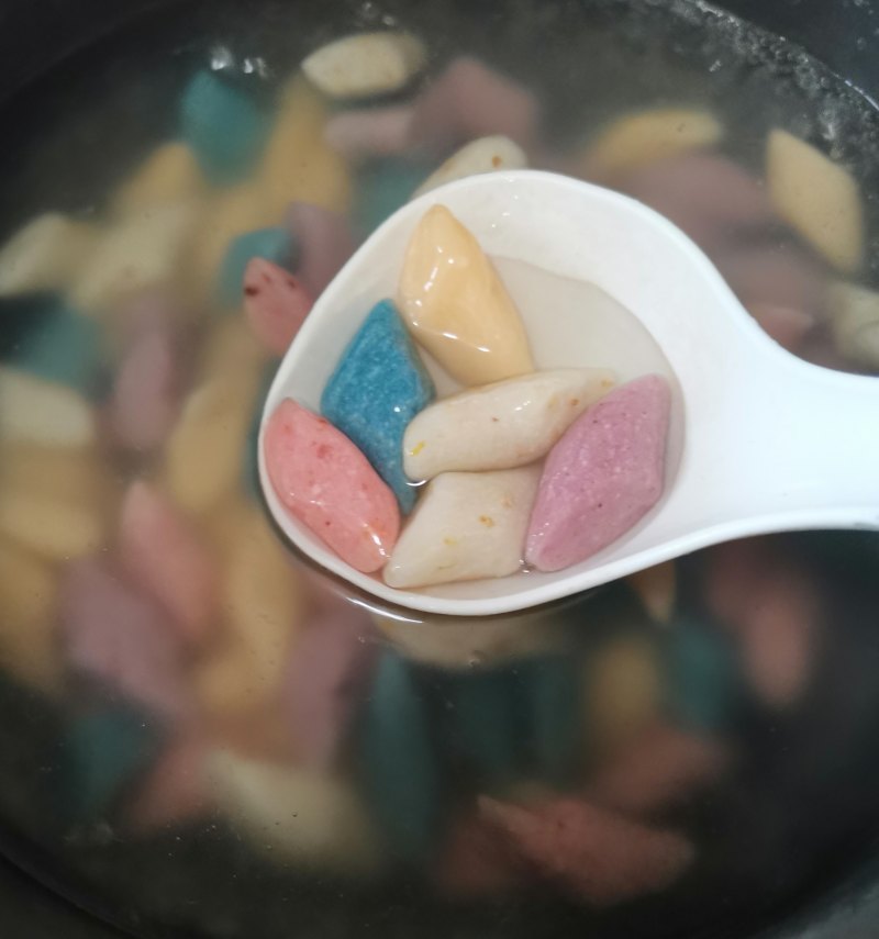 8:放入做好的五色芋圆,用勺子搅拌一下防止黏连。