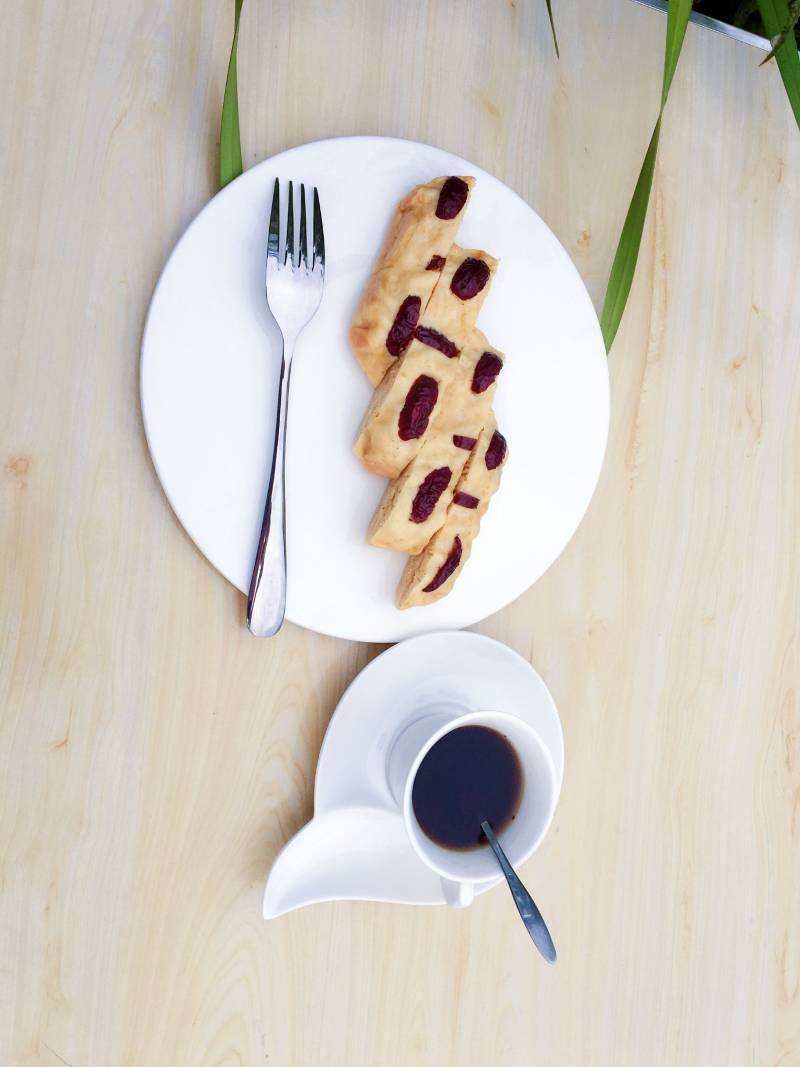 2:红枣去核剪成小粒,越小越好,太大的话入面糊后会沉底,红枣碎,牛奶和红糖放入锅中,小火加热不停搅拌,至红糖融化,倒入碗中晾凉备用。