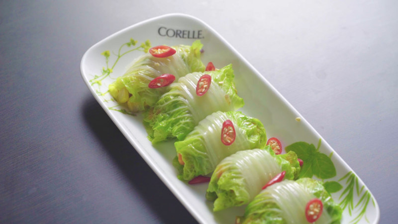 6:把炒熟的食材放在备用的娃娃菜上,完成包好~