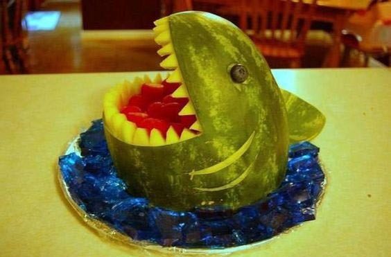 1:西瓜底部稍微倾斜切掉三分之一,顶部如图切80度角左右做嘴巴,把嘴巴边缘切掉2厘米的皮