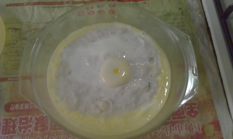 4:打好的蛋糊倒进刚装豆腐的碗里