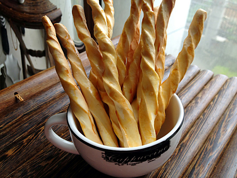 7:薄片切成一厘米宽的长条两端反方向拧一拧,放入烤箱,180度,上下火中层,烤25分钟左右上色即可