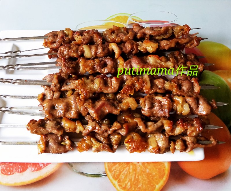 2:五香粉拌在一起腌泡10分钟即可用竹签穿串待烤。微波预热5分钟