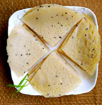 7:锅热后放入面粉糊,一个汤勺分量,摇匀圆形,慢慢煎熟在翻身煎