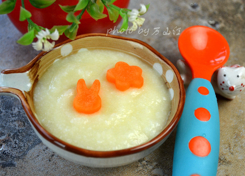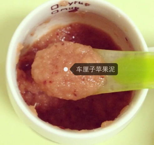 4:搅打成很细腻的苹果糊,煮好就搅打,搅打后的温度刚刚好适合调米糊