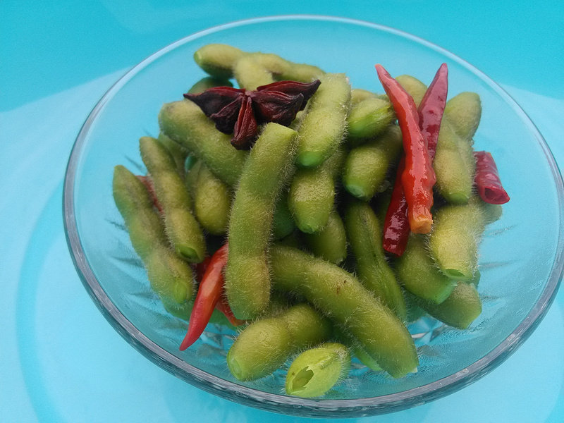 2:锅中一碗水,放入毛豆、八角、干红椒、5克食盐。水开后再煮5分钟,捞出过冰水。