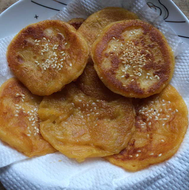 春季的地瓜有筋络,要过筛口感好,这个分量一共做了10个,大小随意,不建议大,不好翻面不易熟。建议用不粘锅。