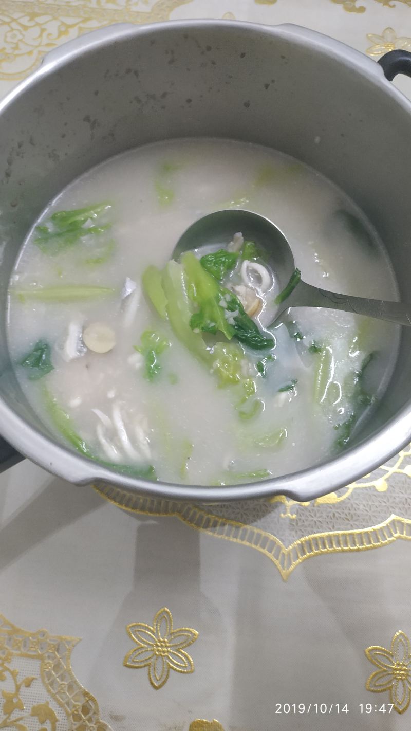 19:倒入的鱼肉煮开后,放入生菜,加点盐调味,然后就倒入刚刚煲好的米饭粥里,搅拌均匀,便可。