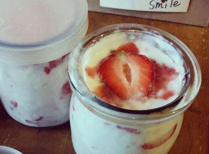 7:挖适量酸奶覆盖在草莓上。