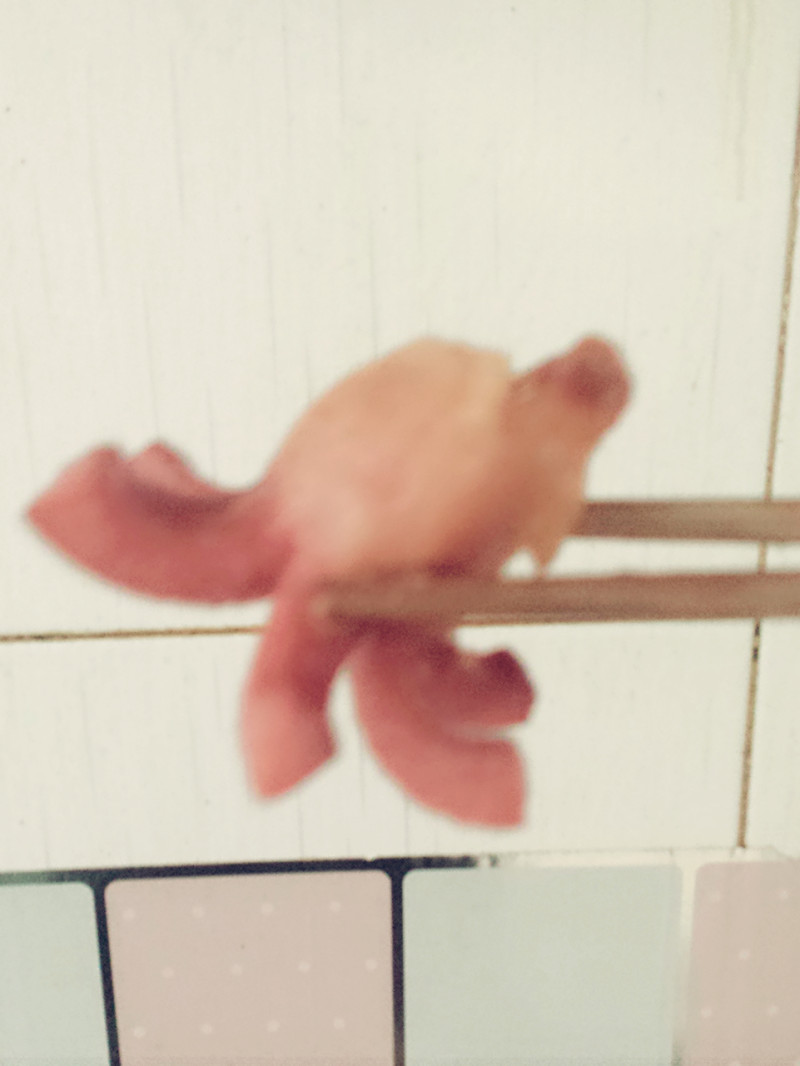 1:我买的是没有色素外皮的台湾肉肠,价格贵了点,但是吃了放心些。刀工不难,把肉肠一切二,手持半截肉肠底部,用小刀剖十字形,下刀深度是半截肉肠的二分之一处,我第一根剖的还可以,第二根剖的太深了些,油煎时肉肠形状会散的太开