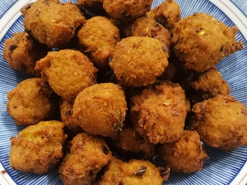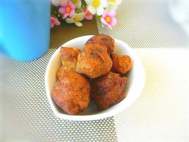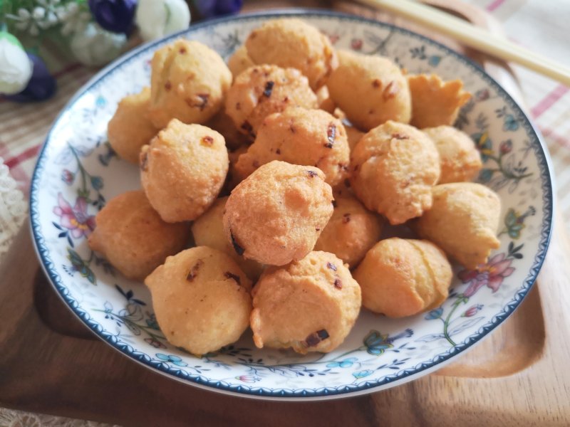 9:外焦里嫩的豆渣丸子上桌啦,咬一口,豆香味,外皮是脆的,里面又是嫩的,伴随着葱香味儿,还真是不错的下饭菜呢。