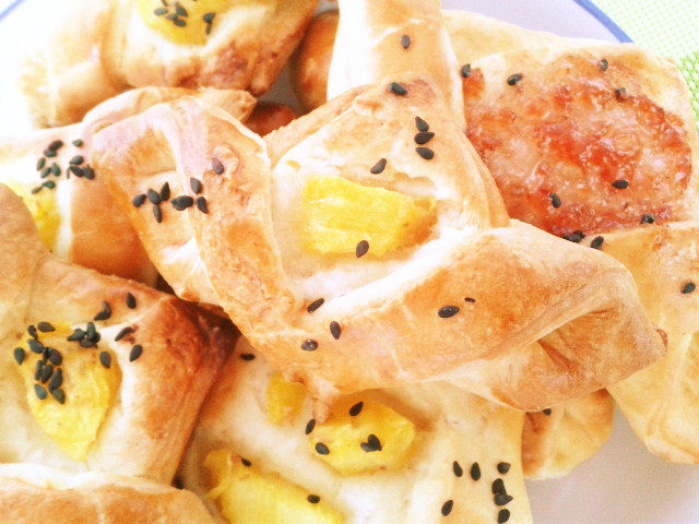 12:中心按上一小块儿菠萝,或者是自己喜爱的果酱,撒上芝麻做点缀。期间烤箱200°预热。然后放入烤箱200°烤制20分钟,我放在中层,好上色,好了之后又180°一下,接着用180°烘烤了3分钟左右出炉的~先做的四个试验一下