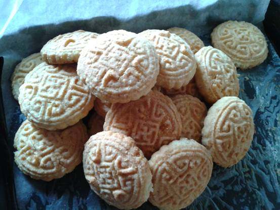 4:做成饼干状,放在月饼模具中压一下,放在铺有油纸的烤盘上,入预热好的烤箱中层,170度,烤20分钟就行了。